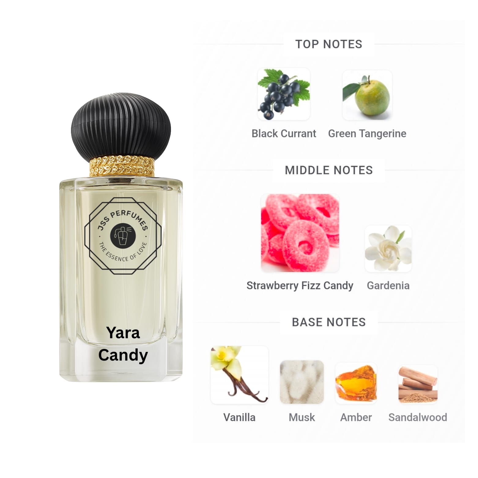 Yara Candy by Lattafa Perfumes is a Floral Fruity Gourmand fragrance for women.