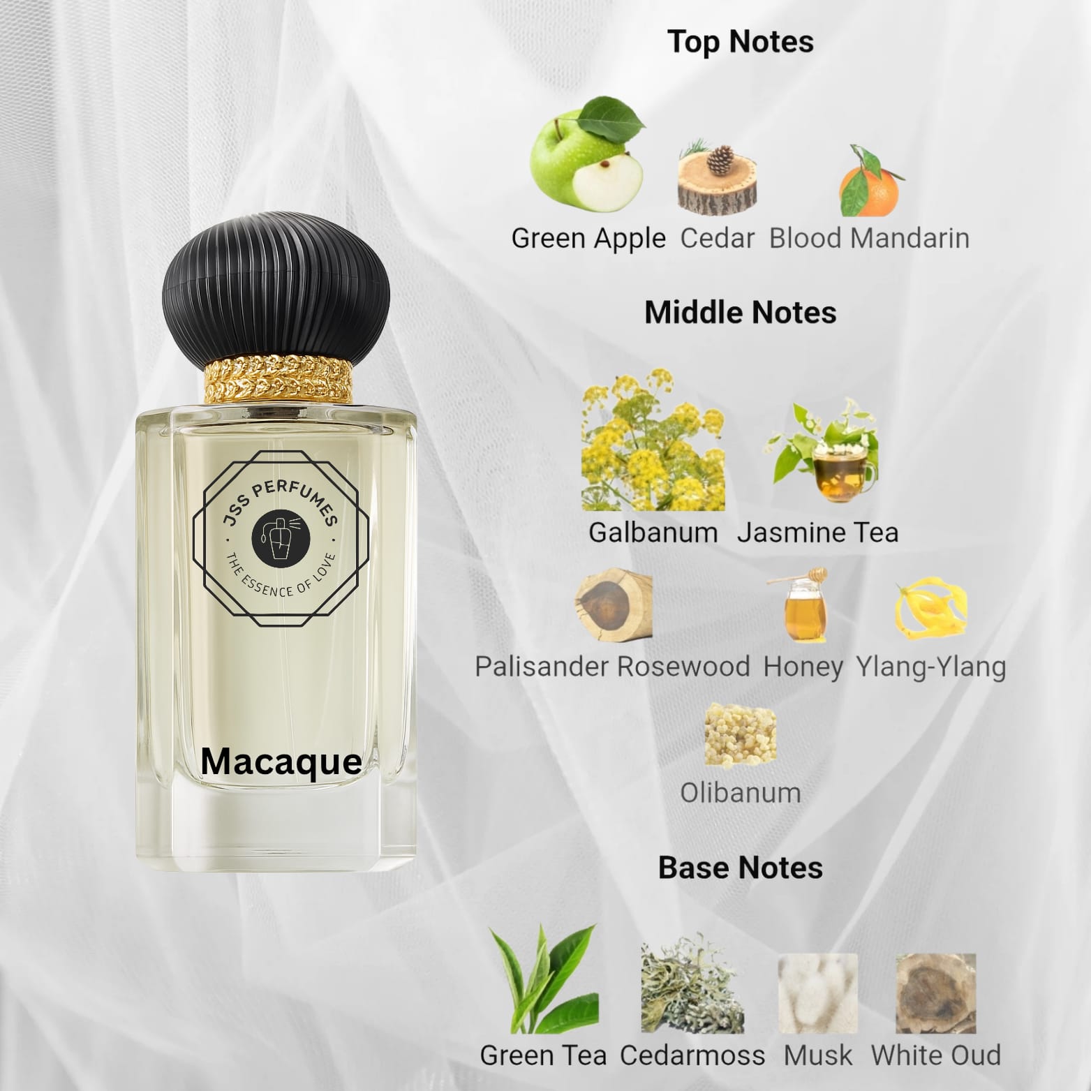 Middle notes are Galbanum, Jasmine Tea, Palisander Rosewood, Honey, Ylang-Ylang and Olibanum;