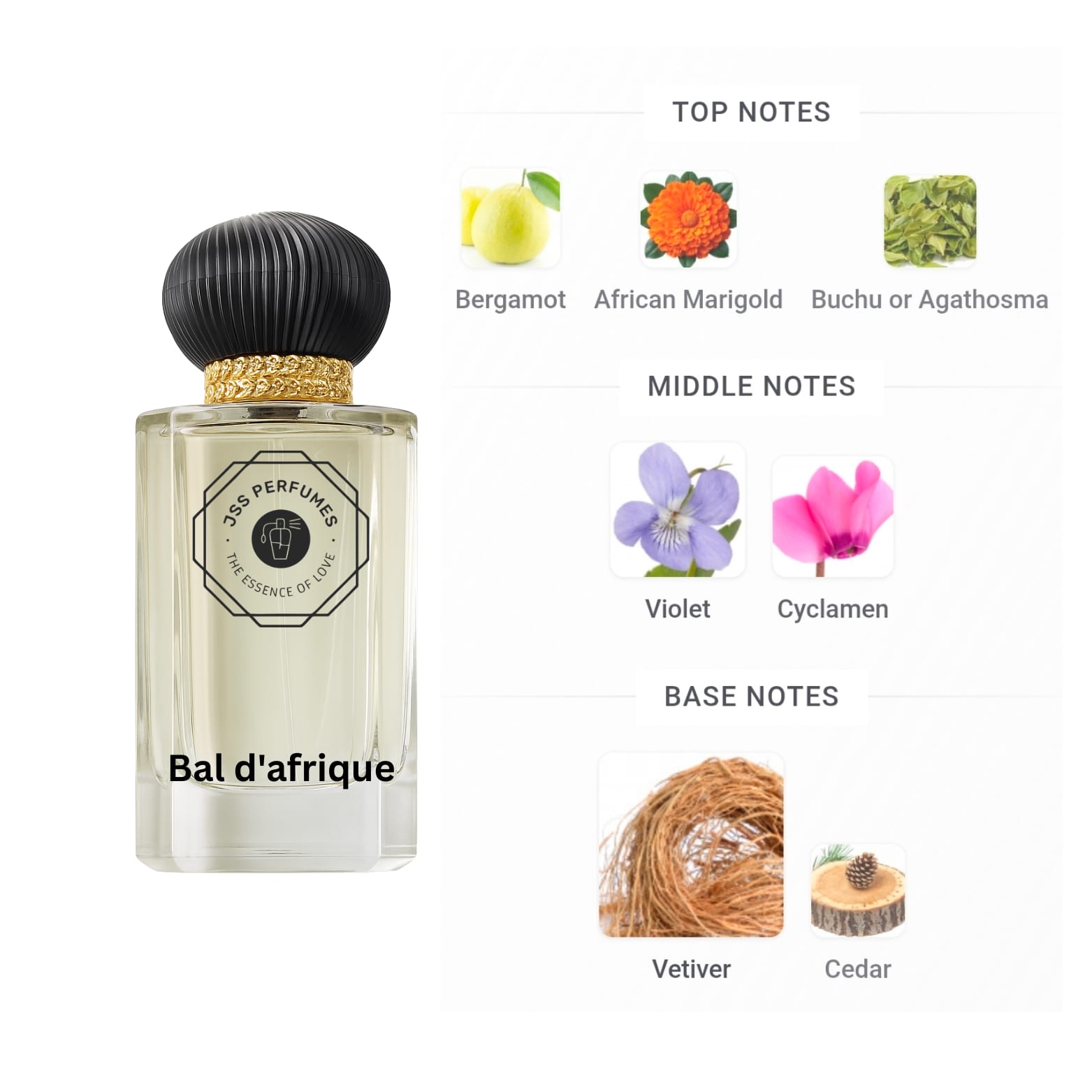 Top notes are Bergamot, African Marigold and Buchu or Agathosma;